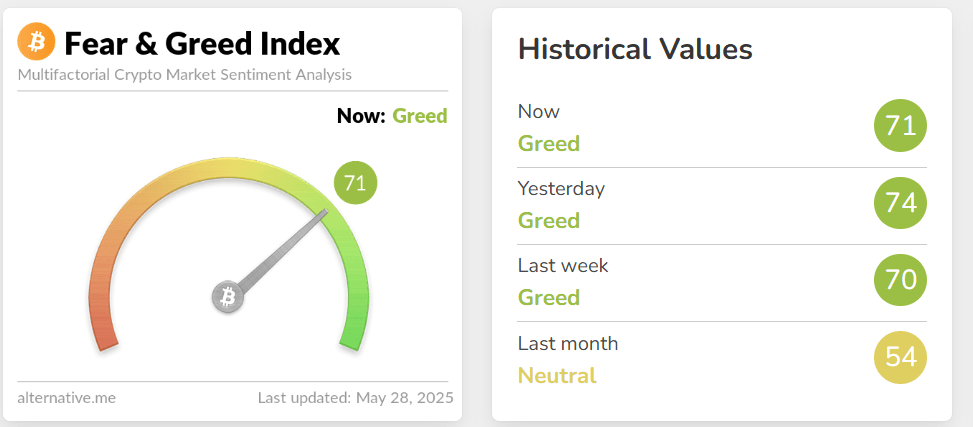The alternative.me Fear and Greed Index, a metric that measures the overall sentiment of the cryptocurrency market, read 71 on Wednesday, indicating high "greed" among investors. Still, it is decreasing from 74 the previous day.