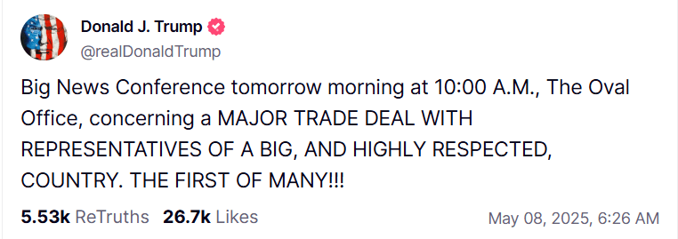 Trump said on the Truth Social platform that he would hold a news conference at 10:00 in Washington, DC (15:00 BST), to announce an agreement with "representatives of a big, and highly respected, country."