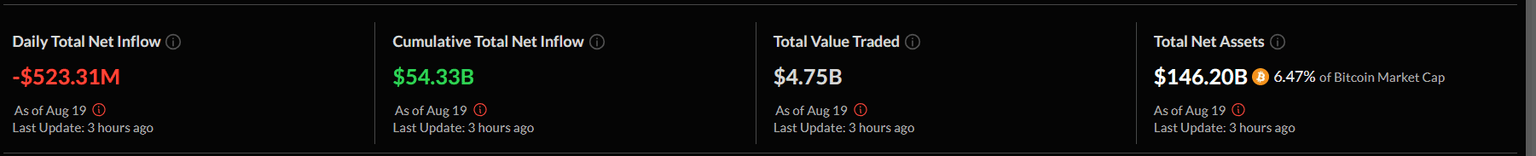 SoSoValue data shows that institutional investors recorded an outflow of $523.31 million on Tuesday, continuing their third day of outflows. If these negative flows continue and intensify, the BTC price could face further correction.