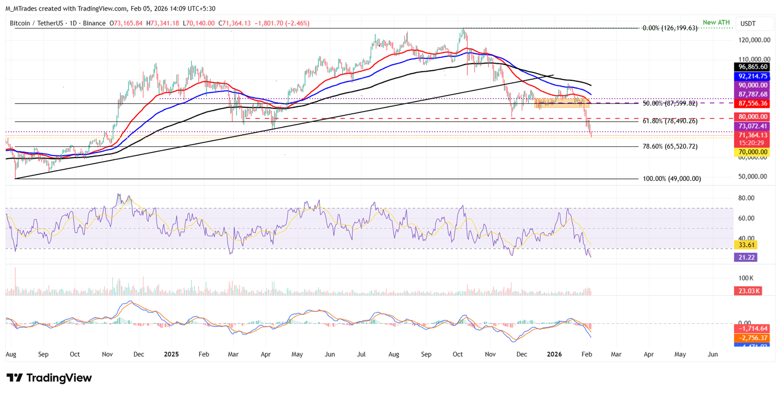 Bitcoin corrects by over 7% so far this week, slipping below the daily support at $73,072 and reaching a daily low of $70,140 on Thursday.