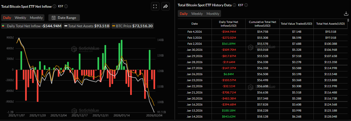 Bitcoin (BTC) price extends losses, nearing the $70,000 level at the time of writing on Thursday, erasing all gains since crypto-friendly candidate Donald Trump won the US presidential election in November 2024. Institutional demand continues to fade, with spot Exchange Traded Funds (ETFs) recording multiple outflows so far this week. As selling pressure persists, attention now turns to Strategy’s (MSTR) Q4 earnings report on Thursday, which could influence near-term direction through any updates on corporate Bitcoin exposure.