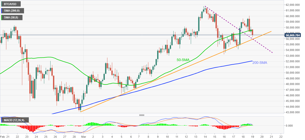 However, a confluence of weekly support line, previous resistance, as well as an ascending trend line from February 28, currently around $55,900, offers a tough nut to break for the BTC/USD bears.