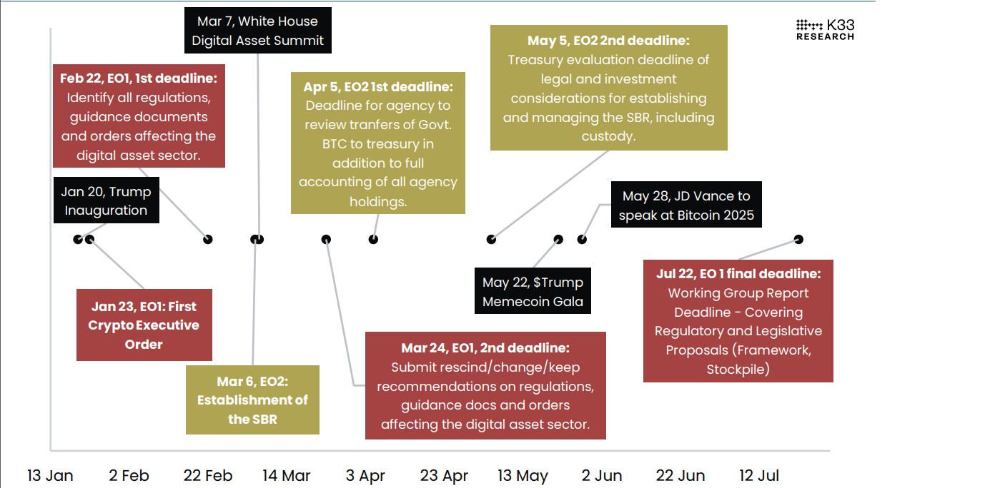 A K33 research report on Tuesday highlighted that there were no substantial updates on Trump’s two crypto-focused executive orders for establishing a Strategic Bitcoin Reserve (SBR) and a national digital asset stockpile.