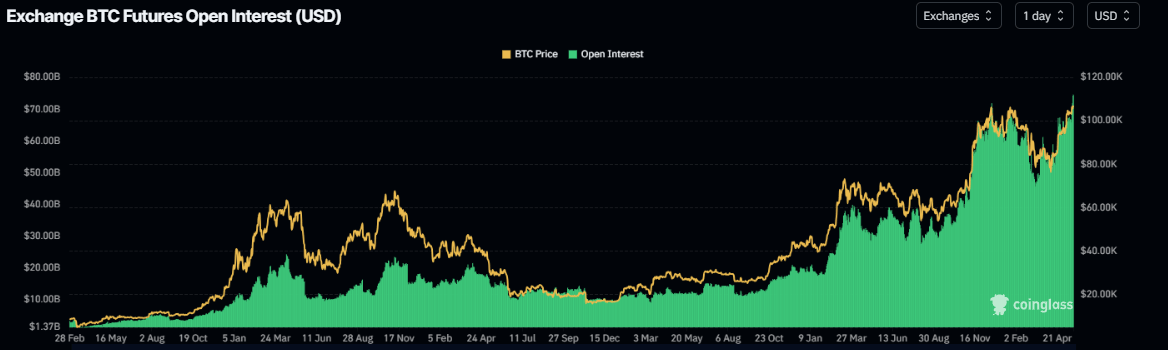 Coinglass’ data shows that the futures’ OI in BTC has reached a new all-time high of $75.14 on Wednesday. Historically, when open interest reached a record high, Bitcoin price generally soared to a new all-time high, as seen in previous bullish cycles. This bullish outlook is because an increasing OI represents new or additional money entering the market and new buying, which could fuel Bitcoin to surpass its ATH of $109,588.