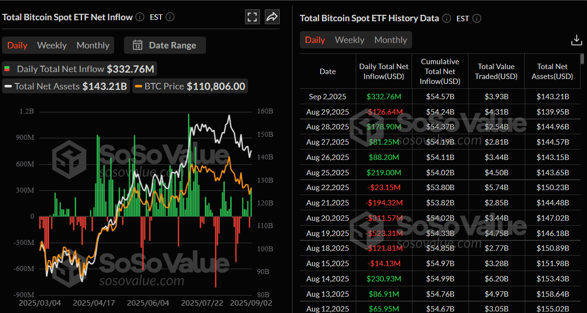 Bitcoin price recovery has been supported by institutional and corporate investors so far this week. The SoSoValue data below shows that Bitcoin spot Exchange Traded Funds (ETFs) recorded a fresh inflow of $332.76 million on Tuesday.
