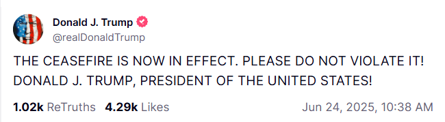 Later on Tuesday, Donald Trump’s Truth Social account posted that “THE CEASEFIRE IS NOW IN EFFECT,” and called on both nations not to violate it, fueling the risk-on sentiment in the global markets.