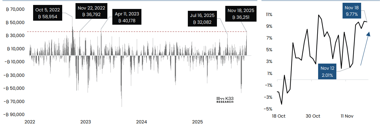 Historical data show that in March 2024, BTC fell 33.57% from its all-time high, while the tariff-driven sell-off in Q1 resulted in a 31.95% drawdown. A decline of similar magnitude today would place BTC in the $84,000–$86,000 range. K33 analysts warn that the resurgence of leverage in the derivatives market could be the catalyst that drags prices toward these levels—or even deeper.