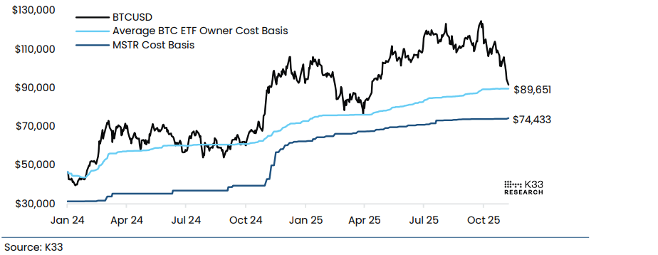 Another widely watched level is MicroStrategy’s cost basis at $74,433, which aligns with Bitcoin’s April 7, 2025, low. While some traders mistakenly believe that a break below this level would force MicroStrategy to sell, the price zone itself remains a significant psychological target that market participants may attempt to chase in a deeper drawdown.