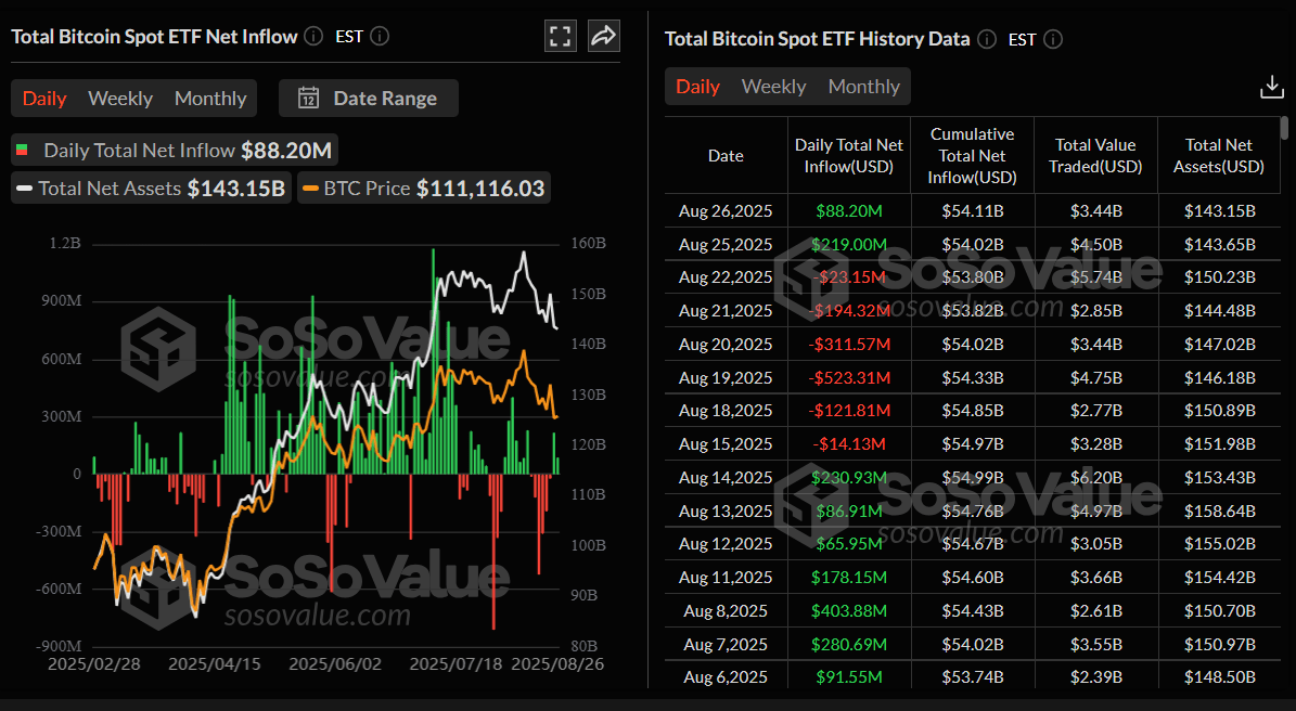 Bitcoin’s institutional demand has also steadied so far this week. SoSoValue data show that Bitcoin Spot ETFs recorded a mild inflow of $88.20 million on Tuesday after breaking a six-day streak of outflows since August 15, the previous day.