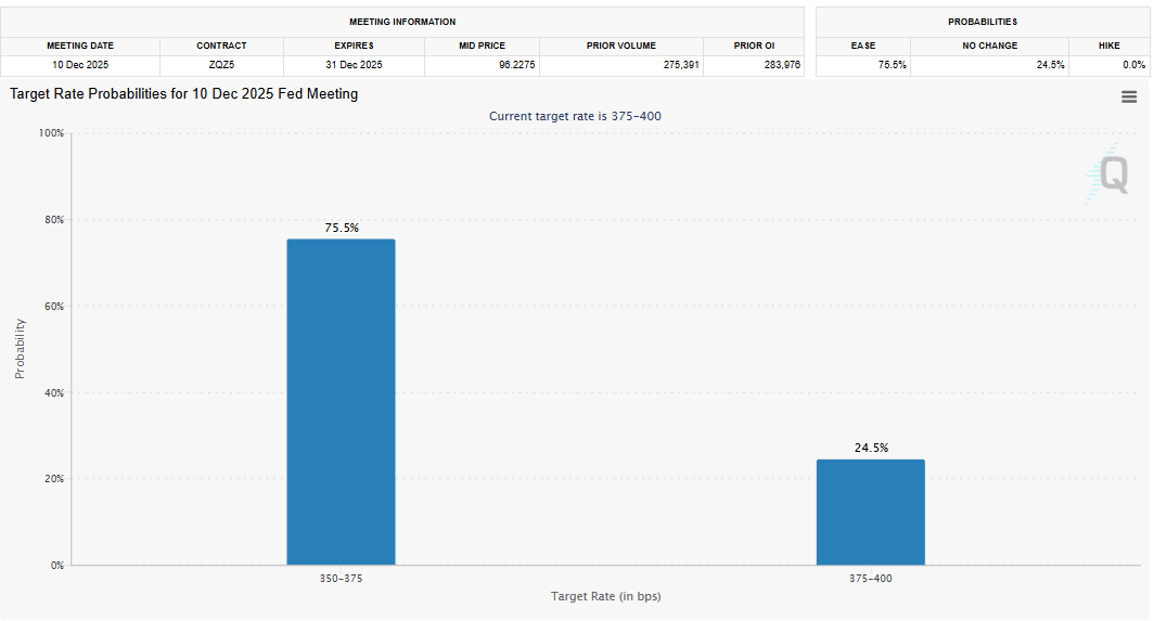 Market participants were quick to react and are now pricing in around a 75% chance that the Fed will lower borrowing costs in December, according to the CME FedWatch tool chart below.