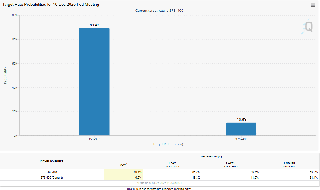 Market participants are currently pricing in an over 89% chance that the US central bank will cut interest rates by 25 basis points at the end of a two-day policy meeting on Wednesday, according to the CME FedWatch tool shown in the chart below.