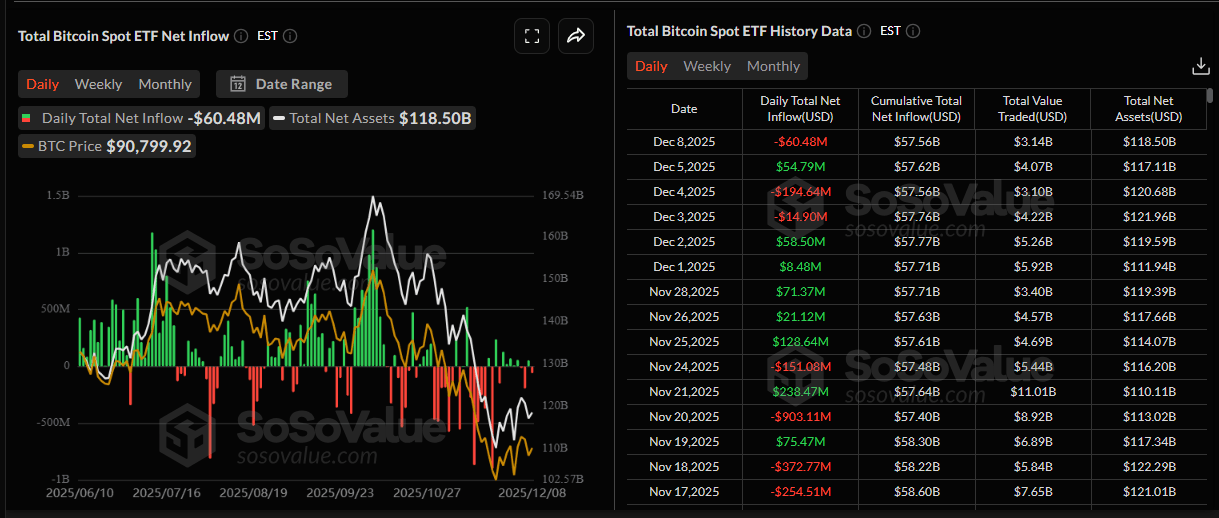 Institutional demand for Bitcoin shows a reduction in selling pressure compared to previous weeks. According to SoSoValue data, US-listed spot Bitcoin ETFs recorded a mild outflow of $60.48 million on Monday, after a streak of outflows last week. For BTC to continue its recovery, the ETF flows should turn positive and intensify.