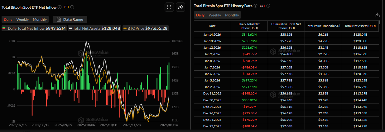 - US-listed spot ETFs recorded an inflow of $843.62 million on Wednesday, marking the third consecutive day of positive flows.