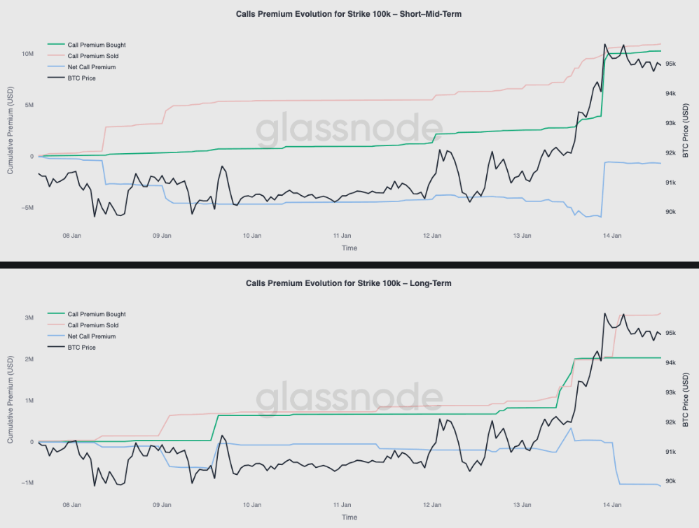 The Glassnode chart below shows that option flows around the $100K strike, indicating that traders are buying more call options than they are selling. This pushes call premiums higher, showing strong demand for near-term upside exposure.