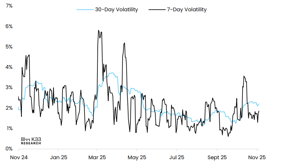A K33 Research report on Tuesday stated that Bitcoin’s recent price correction has occurred in a steady, orderly manner, without a substantial spike in short-term volatility.