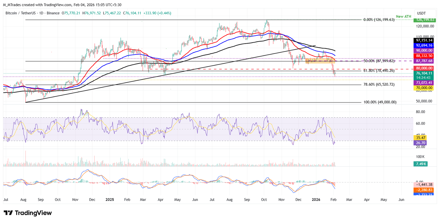 Bitcoin recovers slightly to trade near $76,000 at the time of writing on Wednesday after hitting a low of $72,945, a level not seen since early November 2024, the previous day.