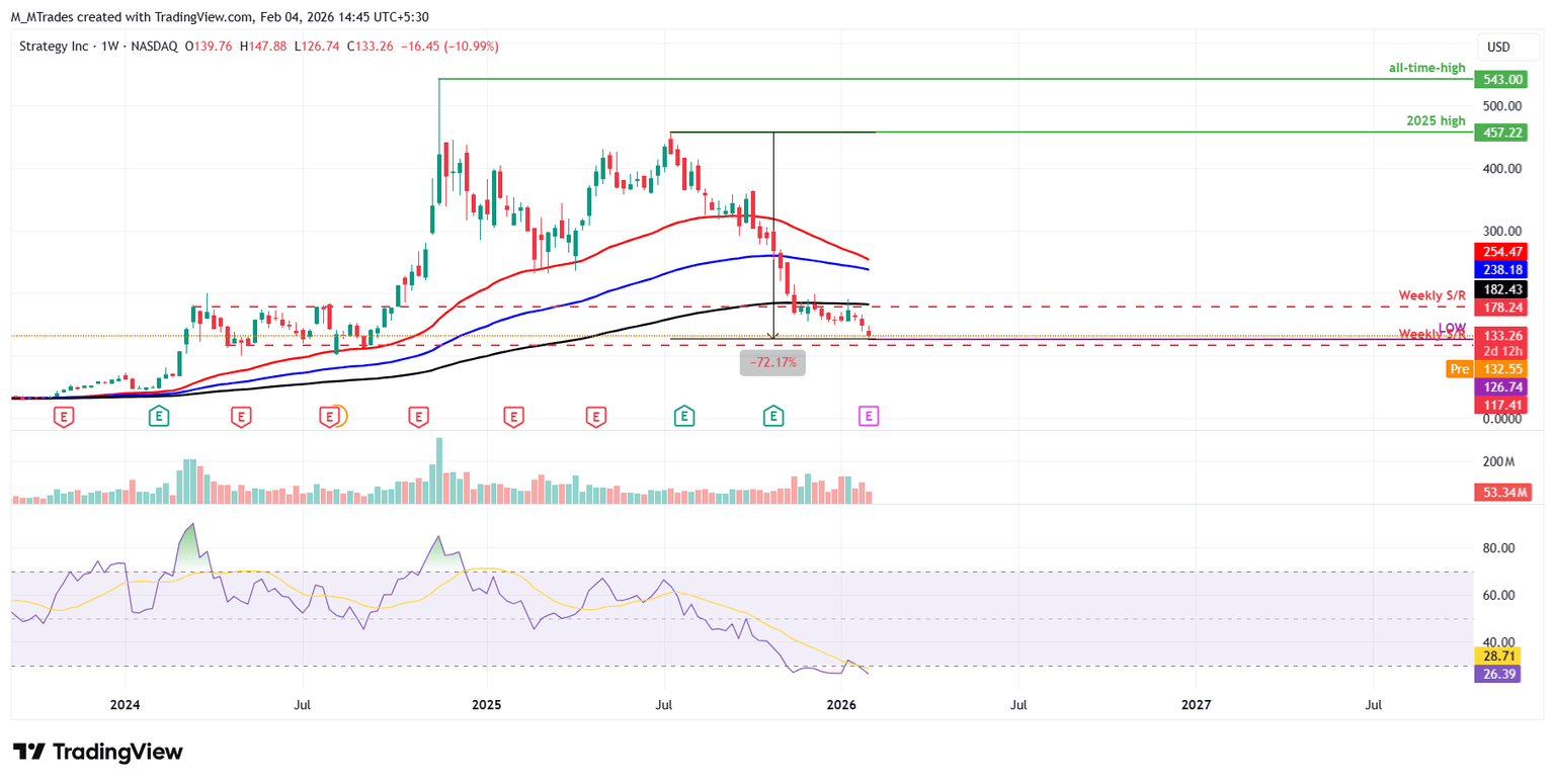 As the largest corporate holder of Bitcoin, with 713,502 BTC in its reserves, Strategy (MSTR) stock price continued its correction, reaching a daily low of $126.74 on Tuesday, a decline of more than 70% from its 2025 high of $457.22.