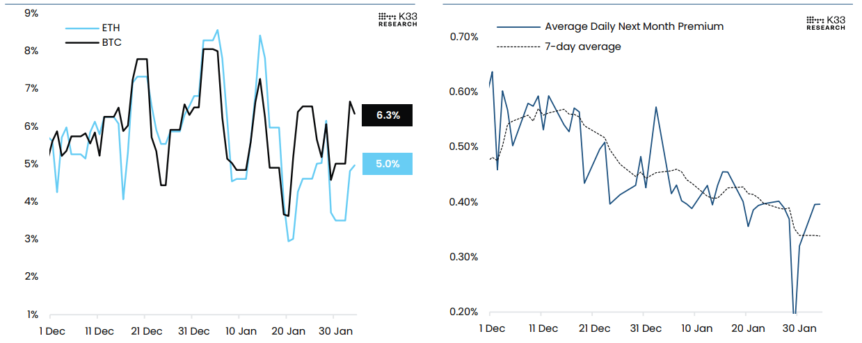 The chart (left) below shows that the annualized BTC futures premium was holding steady at 6.3% on Tuesday, consistent with premiums observed over the past three months, signaling that traders remain largely hands-off amid the dicey environment of relative weakness. In addition, while futures premiums have been stable, the term structure continues to trend lower, with CME’s 7-day (right chart) average next-month premium currently at lows not seen since the US banking crisis of March 2023, pointing toward considerable reluctance to add calendar risk.