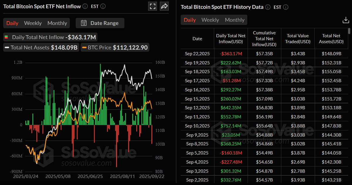 SoSoValue data shows that Bitcoin spot ETFs recorded an outflow of $368.17 million on Monday, the highest single-day outflow since mid-August.