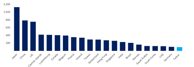 The US Treasury predicts that T-bills held by stablecoin issuers (excluding interest-bearing stablecoins) will grow to approximately $1 trillion by 2028. Tether alone holds over $120 billion in Treasury bills as of Q1 2025, as shown in the graph below, and ranks among the top holders of US Treasuries.