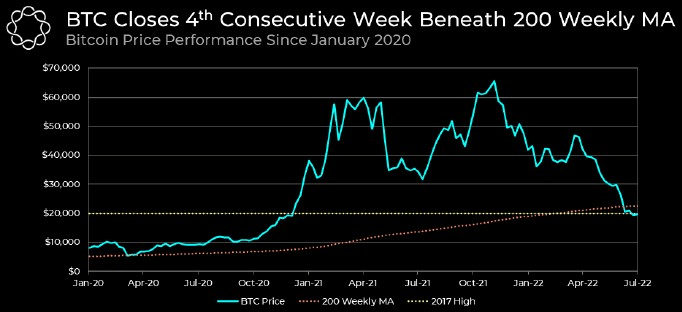 According to cryptocurrency research firm Delphi Digital, Bitcoin has now closed below its 200 weekly average for four consecutive weeks, a development that has historically “marked previous market bottoms.”