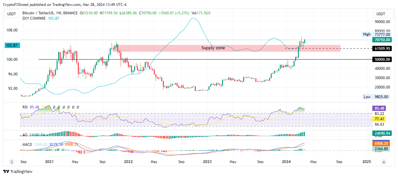 On the other hand, if traders start to cash in on the gains made so far, Bitcoin price could retract. A weekly candlestick close below the midline of the supply zone at $61,509 would encourage more sell orders, causing BTC price to fold toward the $50,000 range.