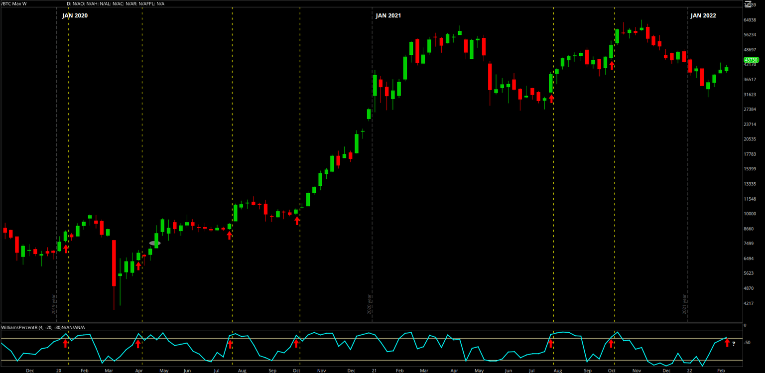 A final bit of analysis that also took BTC momentum into consideration was offered by market analyst and Twitter user Caleb Fransen, who posted the following chart that included the Williams%R oscillator, a momentum indicator that measures overbought and oversold levels.