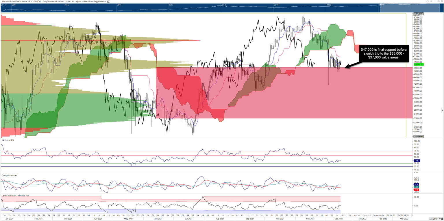 Bitcoin price has been testing its final support zone near the $47,000 value area for the past twelve trading days. Bulls have become increasingly nervous, but a significant amount of buying and selling has occurred in the $47,000 to $49,000 price ranges. So much so that it is very close to creating a new 2021 Volume Point Of Control (prior was at $57,000.