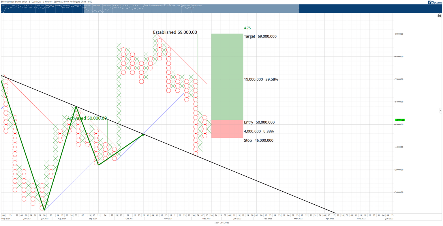 The $1,000/3-box reversal Point and Figure chart show that a bullish reversal pattern is developing. The hypothetical long idea is a buy stop at $50,000, a stop loss at $46,000, and a profit target at $69,000. The profit target is derived from the Vertical Profit Target Method in Point and Figure Analysis. A two to three-box trailing stop would help protect any implied profits.