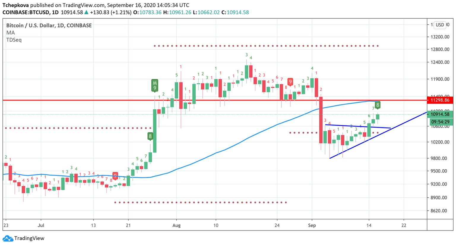 BTC/USD is changing hands at $10,980, getting ready to retest the psychological barrier of $11,000 for the first time since the sharp sell-off on September 3. As the price broke from the triangle pattern and extended the recovery above the local resistance of $10,700, many bullish BTC traders believe that the coin is on the verge of a massive upside move. However, the technical and on-chain data paints a different picture.
