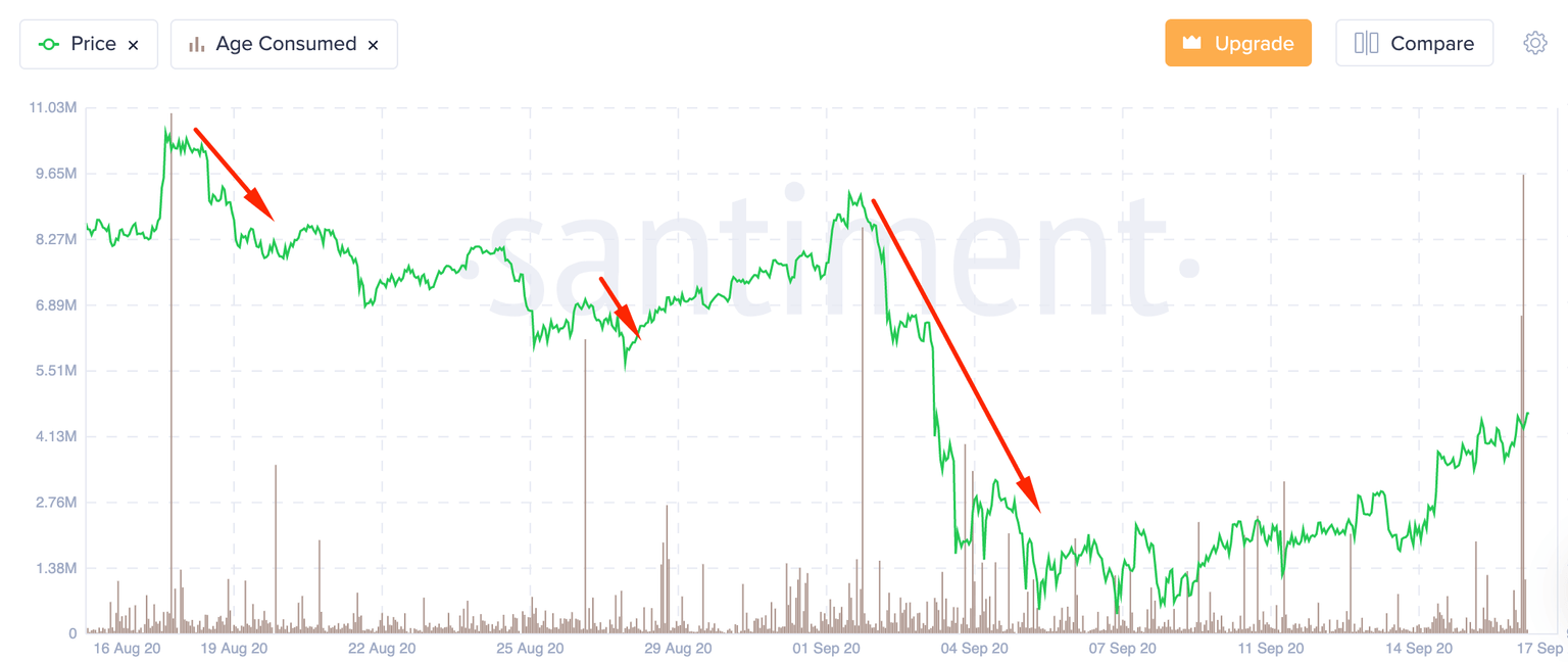 Bitcoin may be in for massive volatility according to the Age Consumed metric, provided by Santiment. This parameter shows how many tokes have changed their addresses on a specified date. Spikes in the graph usually appear before large price movements as they mean that a large number of tokens have come to motion after being idle for some time. As the chart below shows, three previous BTC prices went down on three earlier occasions of Age Consumed increase.