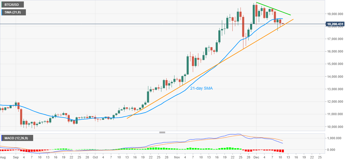 BTC/USD holds lower ground, currently near the intraday low of 18,172, during early Friday. The crypto major marked the second failure to break an upward sloping trend line from October 09 the previous day. However, bearish MACD and extended weakness below the 21-day SMA favor the Bitcoin sellers.