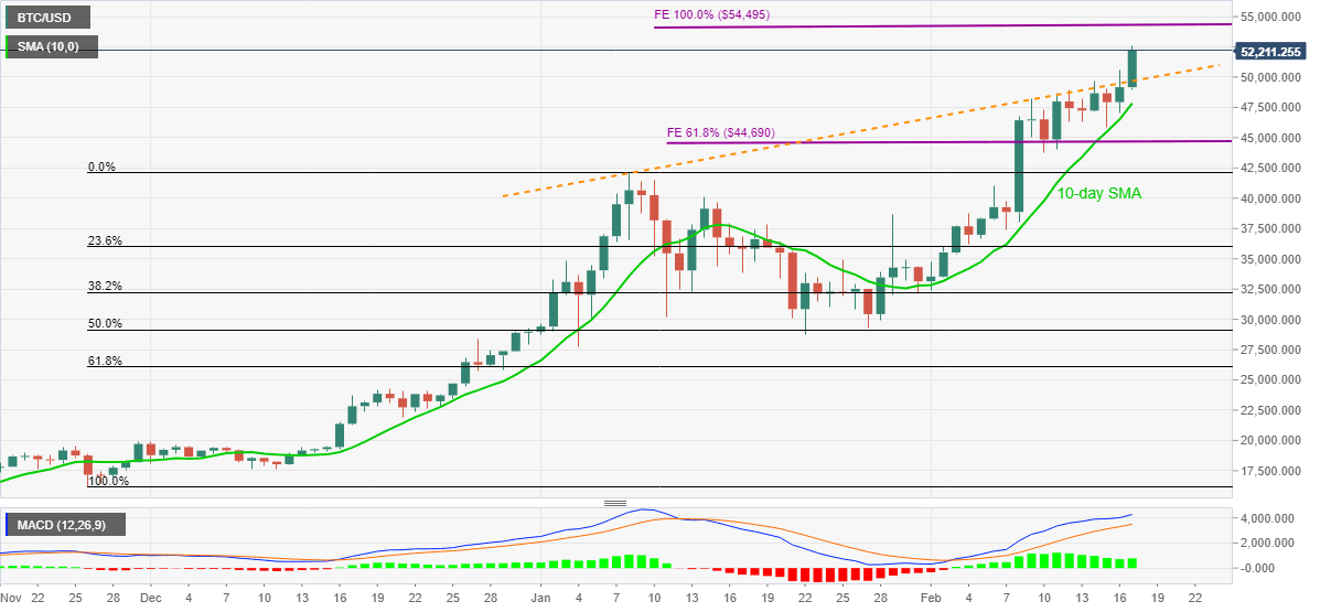 Bitcoin remains on the front foot despite the latest dribbling around the record top of $52.638 during early Thursday. In doing so, the BTC/USD pair keeps the previous day’s upside break of short-term key resistance line while extending run-up beyond 61.8% Fibonacci Expansion (FE) of November 26, 2020, to January 08, 2021, upside and the following pullback to $28,768 on January 22, 2021.