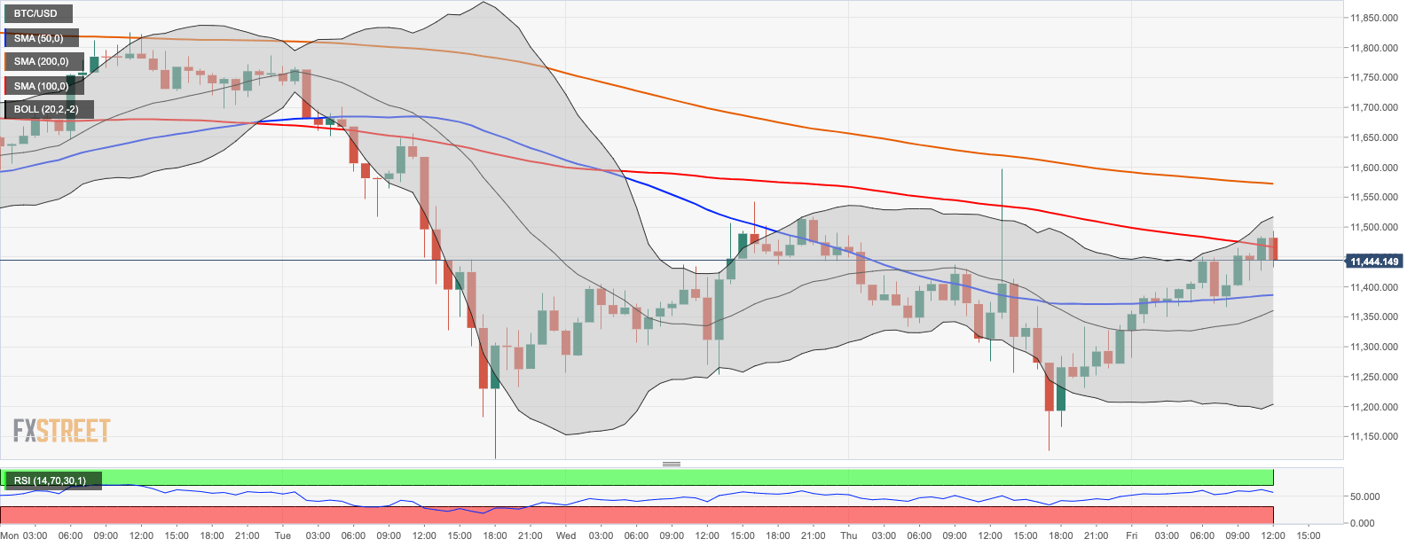 Bitcoin (BTC) has been range-bound below $11,500 since the middle of the week. A cluster of technical barriers prevents the price from moving upwards towards the next critical resistance created by $12,000. At the time of writing, BTC/USD is changing hands at $11,440, having recovered from the intraday low of $11,281. The coin is mostly unchanged both on a day-to-day basis and since the beginning of the day.