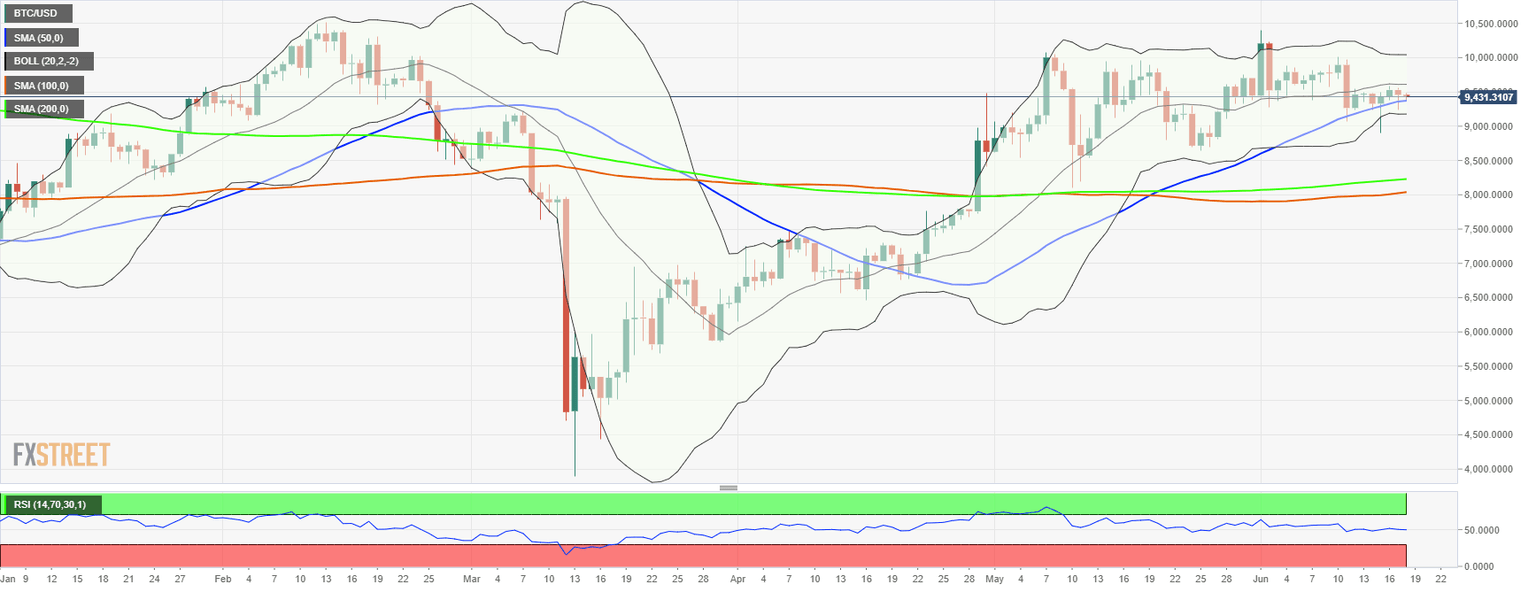 Bitcoin (BTC) has barely moved since the start of the day. Moreover, the first digital asset has been locked in a tight range since May 15 as the cryptocurrency market strugglse to find the direcion amid rising global uncertainty. The downside movements are limited by the daily SMA50 and 1-hour SMA200 located under $9,400, while the upside is capped by $9,550.