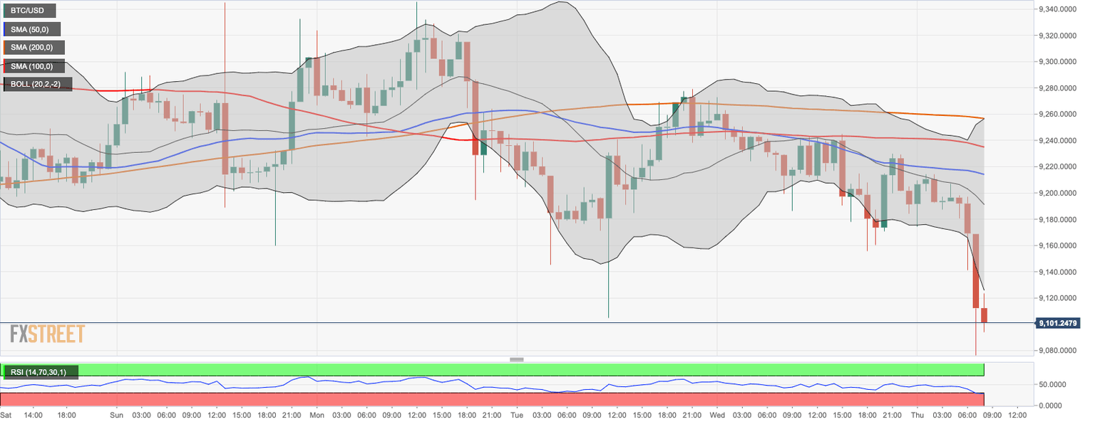 Bitcoin (BTC) tested the intraday low of $9,076 amid massive sell-off on the cryptocurrency market and recovered to $9,1120 by press time. The first digital coin has been drifting lower since the start of the day amid global sell-off on the cryptocurrency market. Currently, BTC/USD is moving within a short-term bearish trend, the volatility is high.