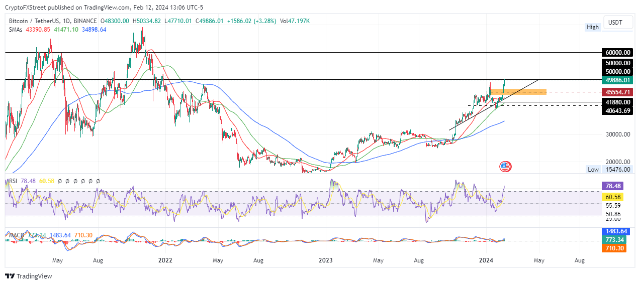 Increased buying pressure could see Bitcoin price make a decisive move above the $50,000 blockade with a possible extension to the $60,000 psychological level. Such a move would constitute a 20% climb above current levels.