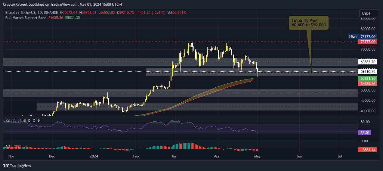 Specifically, the market appears to be factoring in a single interest rate cut in 2024, expected in December. At the time of writing, Bitcoin price is trading for $59,210, after an intra-day low of $56,552.