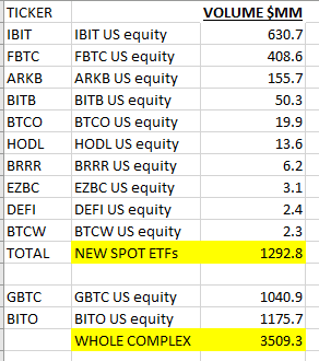 Re what all these dollars flying around means. For the 10 fresh ETFs volume = buying btc today. Clear cut. But, GBTC volume prob ALL selling and maybe $BITO has some too so likely a lot offsetting going on. Just my take tho, not 100%, we'll know more when flows hit tonight