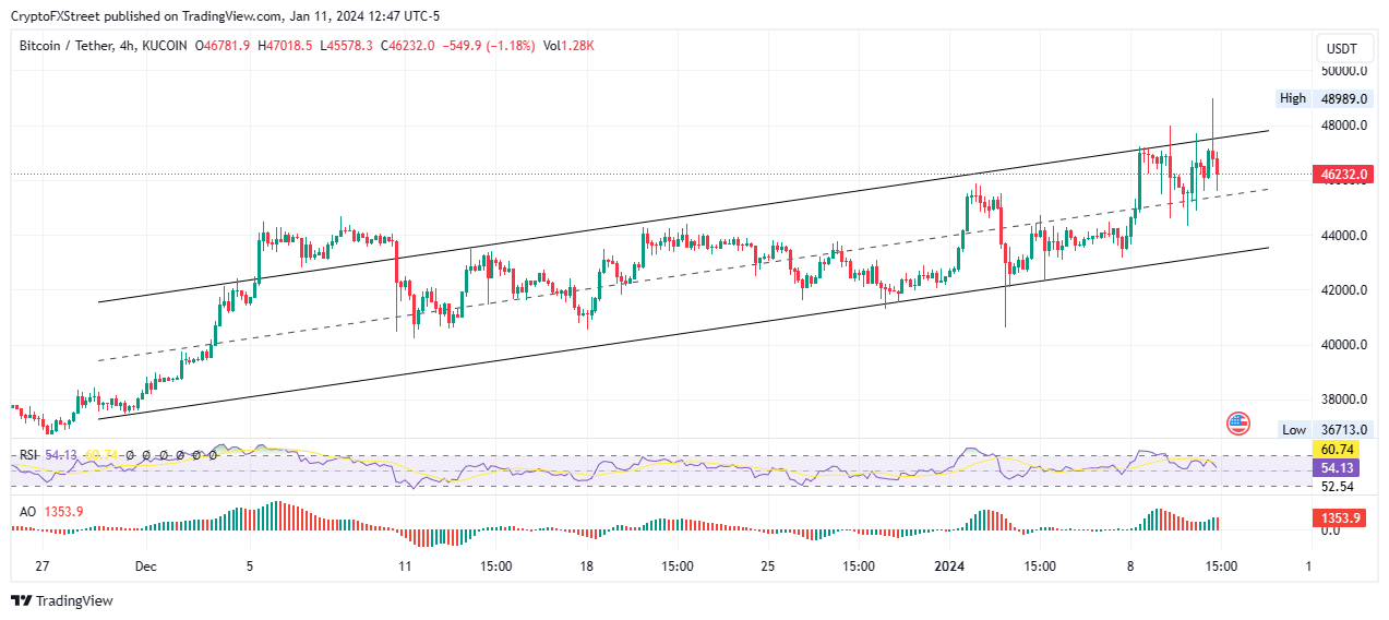 On the four-hour timeframe, Bitcoin price is consolidating within an ascending parallel channel, with the reaction to spot BTC ETF trading and the US CPI inflation reading sending BTC above $48,000, recording an intra-day high of $48,969.