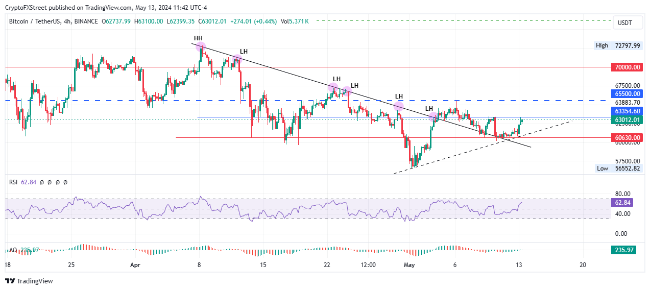 - A break above $63,354, previous lower high, would be a sign of strength, but $65,500 is more enticing.