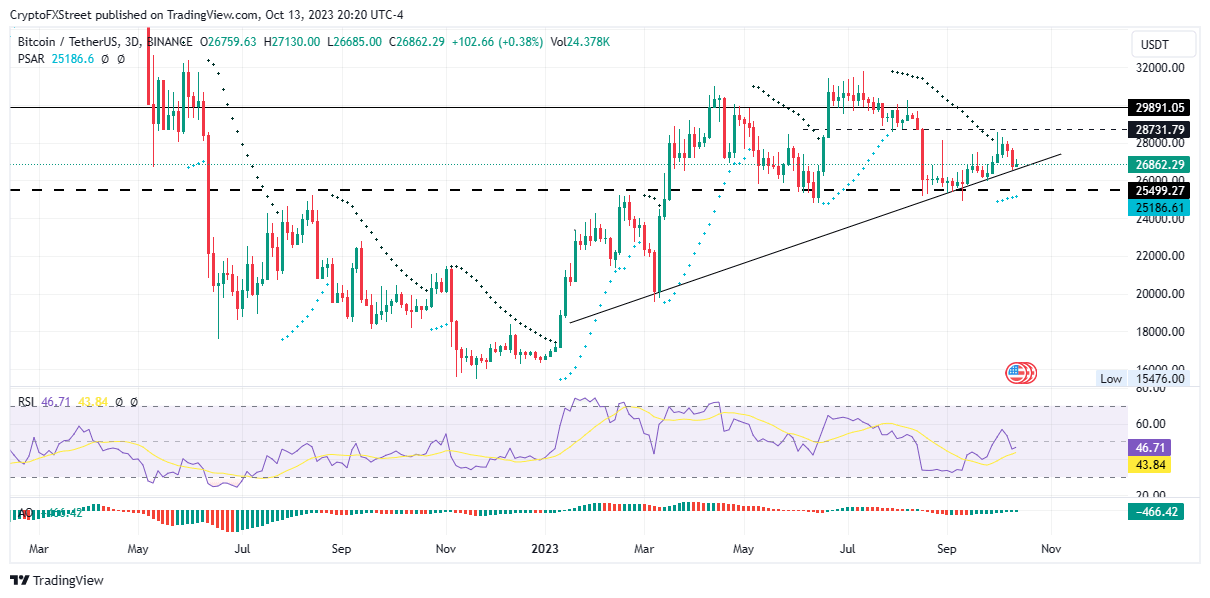 Conversely, early profit-taking could send Bitcoin price below the critical support offered by the ascending trendline around the current price of $26,862. While a break below this level could inspire the bears, the upside potential would only be invalidated once BTC records a three-day candlestick close below the $25,499 support level. This could expose BTC to a retest of the $24,000 psychological level.
