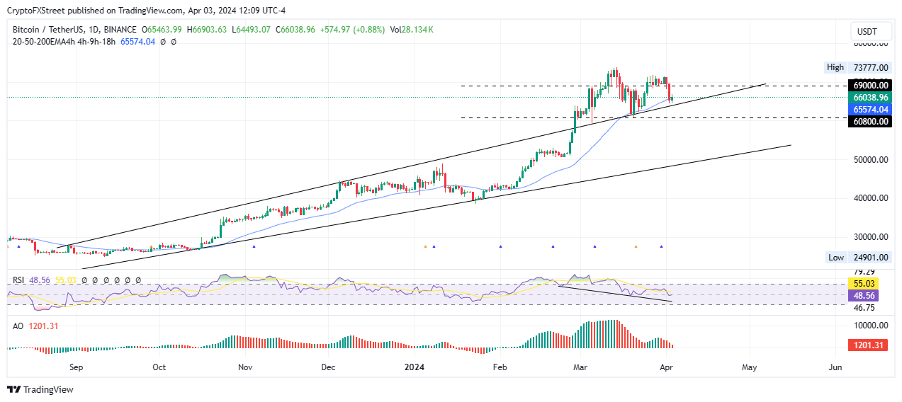Bitcoin price has slipped below the support offered by a critical support level, the 200-day Exponential Moving Average (EMA) at $65,574. However, the breakdown is not decisive as the pioneer cryptocurrency continues to hold above one of two trendlines that have been pivotal in BTC action for over six months.