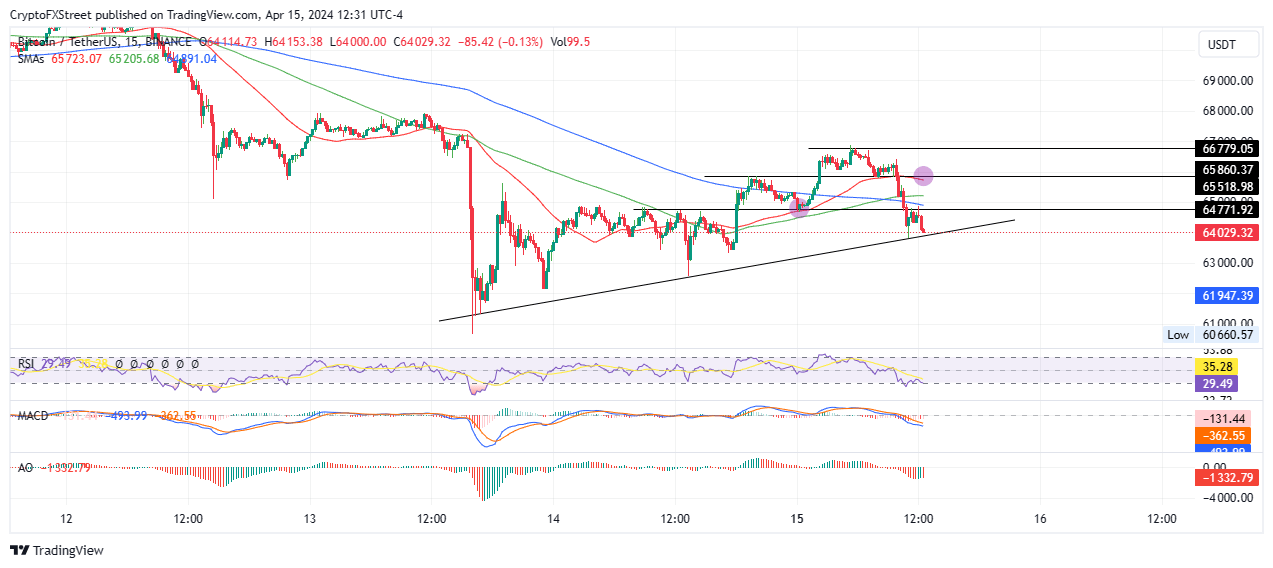A bounce atop this base would inspire more buy orders, sending BTC price to the local top at $66,779 on the 15-minute time frame.