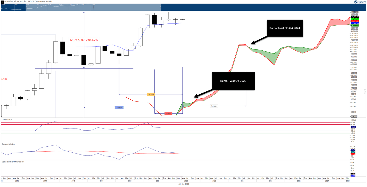 The Ichimoku Kinko Hyo system shows that Bitcoin's price remains overwhelmingly bullish remains in an overwhelmingly bullish state. Since Q2 2021, the 3-month Tenkan-Sen and Kijun-Sen have acted as BTC’s primary support. However, an upcoming Kumo Twist between Q3 2022 and Q4 2022 may signal a forthcoming bearish turnaround that may last well into 2024.