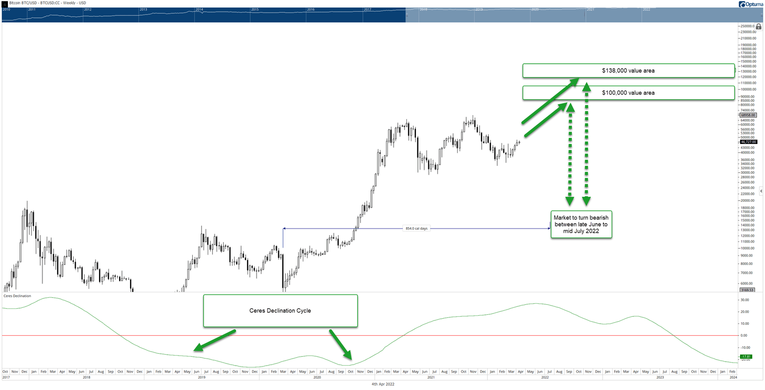 Bitcoin is very sensitive to this Cycle and has been for almost twelve years. The current Ceres Declination Cycle peaks in mid-June 2022 and begins to slope south in early July 2022. Additional Gann and astronomical cycle dates converge when the Ceres Declination cycles begin to slope down – all dates for 2022: