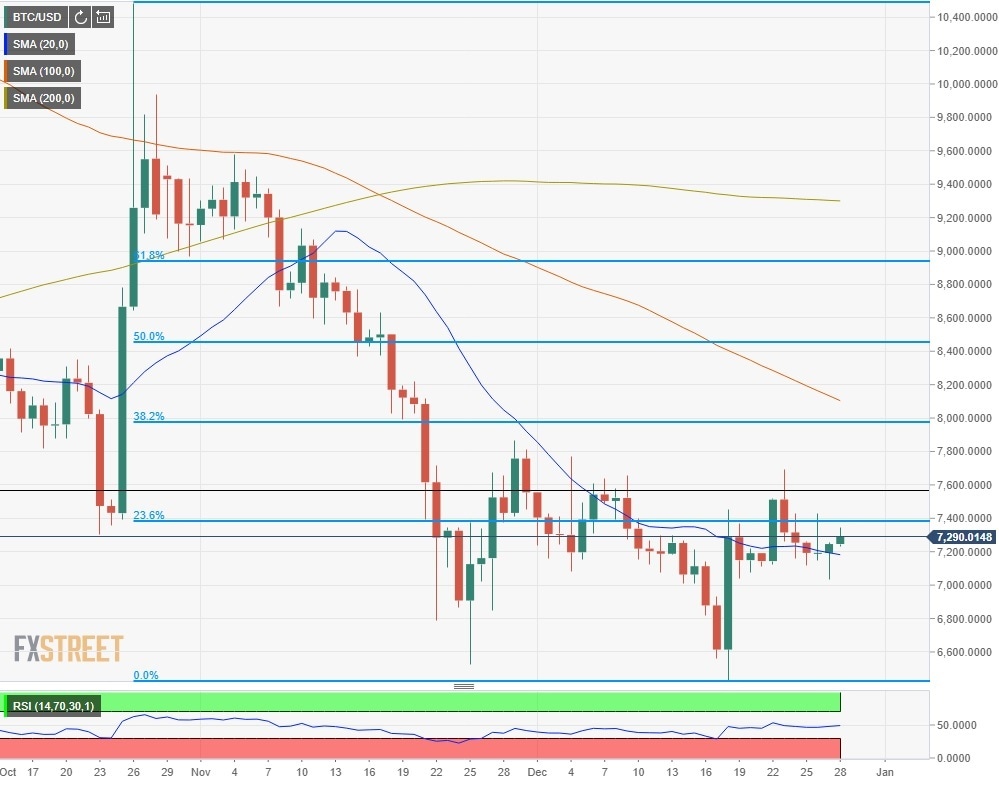 However, the Fibonacci 23.6% retracement of the October 26-December 18 drop is located at $7400 and the pair could have a difficult time breaking above that level. Additionally, a static resistance seems to have formed near $7600 ahead of $8000 (Fibonacci 38.2% retracement October 26-December 18 drop). On the other hand, the 20-day MA could be seen as the initial support at $7180 ahead of $7000 (psychological level) and $6430 (December 18 low).