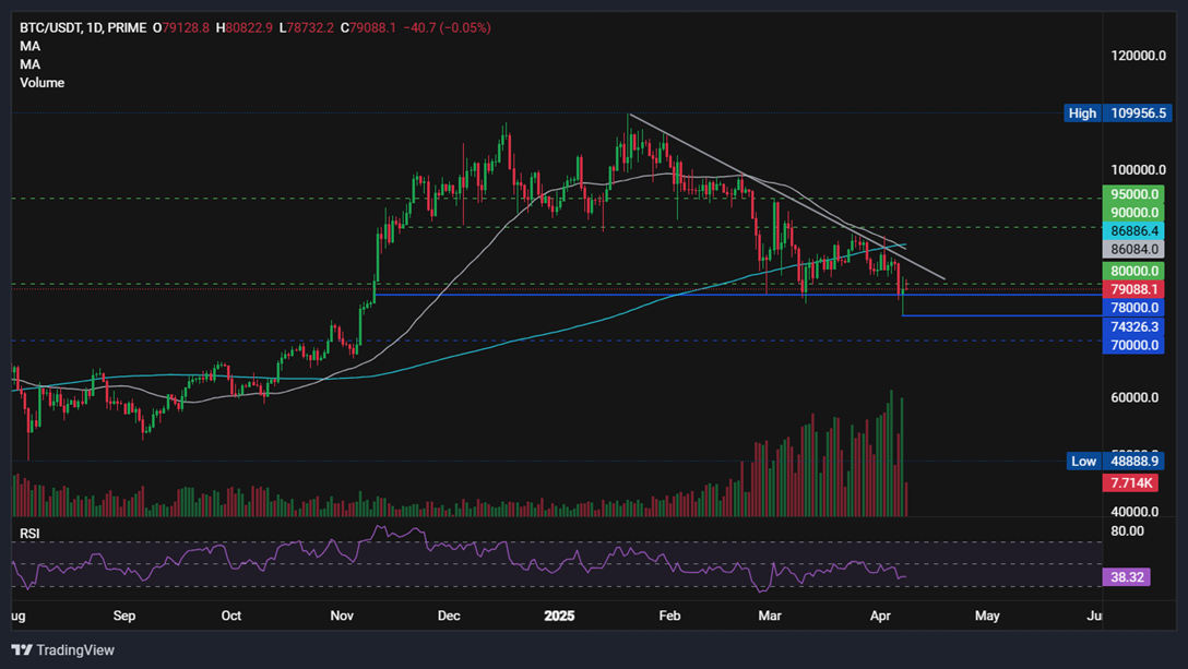 Sellers will need to break below 78k and 74.4k, the 2025 low, to create a lower low and extend the bearish decline toward 70k.