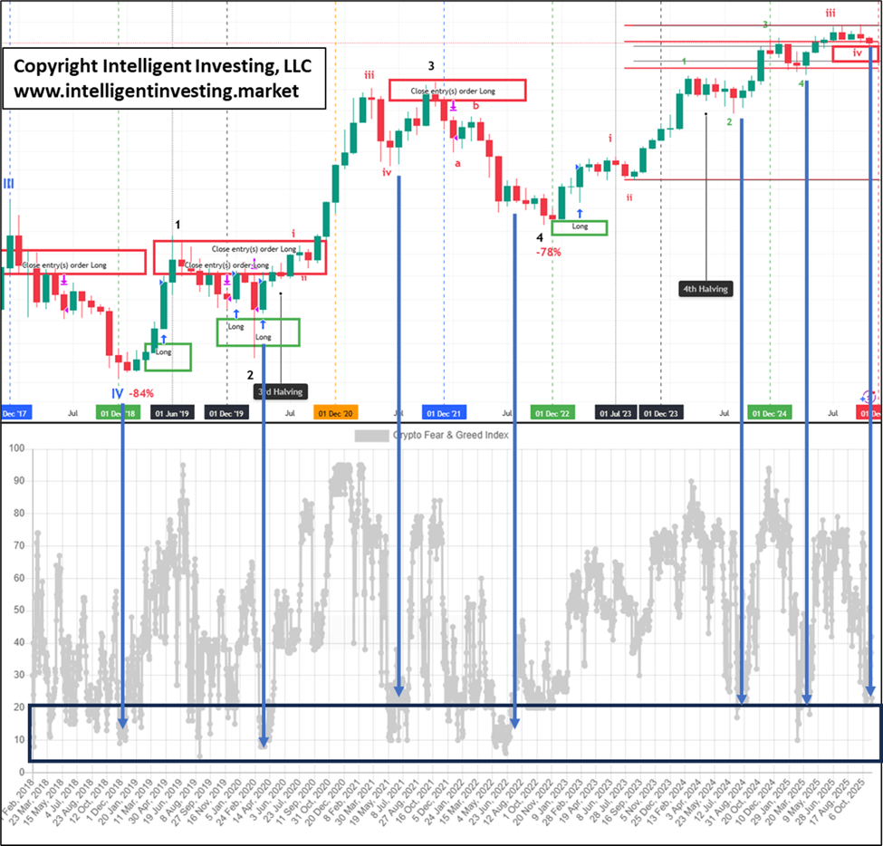 Thus, despite the recent detour, Bitcoin remains in fourth gear with all signs pointing toward a rally to $164K. A drop below $86K would strongly indicate that $126,272 was the peak on October 6 and that the purple C4 wave to around $20,000 ± $2,500 is now beginning. However, our long-term trading system* will also need to signal a sell, as it did in August 2014 (not shown), June 2018, and January 2021, to confirm that the top has been reached. Lastly, sentiment is currently near key bottom levels; the Fear and Greed Index was at 21 yesterday, although data has been available only since early 2018. See Figure 3 below. Such negative sentiment can pave the way for the next rally.