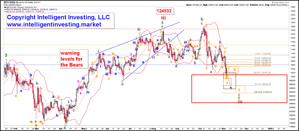 These levels can act as stops to lock in gains or prevent further losses. Three days after our update, Bitcoin dropped to $105,833 intra-day, invalidating the bullish Elliott Wave (EW) count. Fast forward, BTC fell to as low as $98,932 yesterday, November 4. That’s 16% and 14% below our orange and red warning levels, respectively, showing loss mitigation.